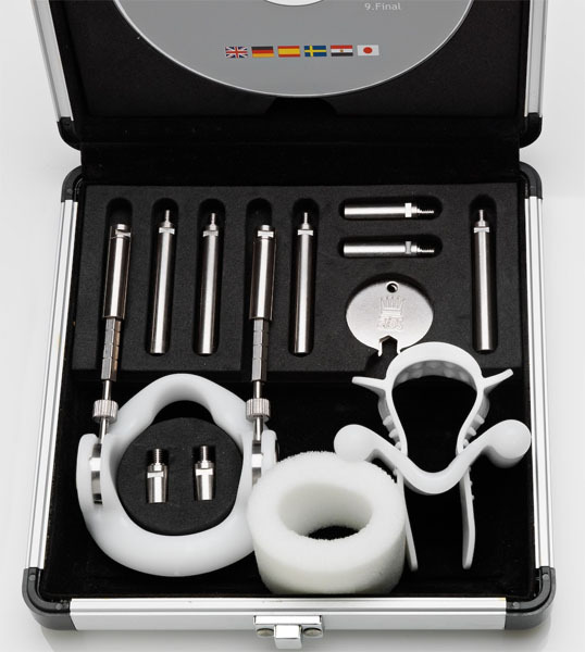 Прежде чем надеть экстендер на пенис, необходимо установить стартовую длину штанг. Затем ввести член в упорное кольцо так, чтобы оно оказалось у самого основания члена. После, оттянув крайнюю плоть, на головку требуется натянуть смягчающую прокладку и наложить ремешок-фиксатор. Последний этап – установка величины натяжения. Для этого следует воспользоваться винтовым механизмом: вращать винты на штангах до требуемого значения (имеются насечки 600, 900, 1200 и 1500 грамм).